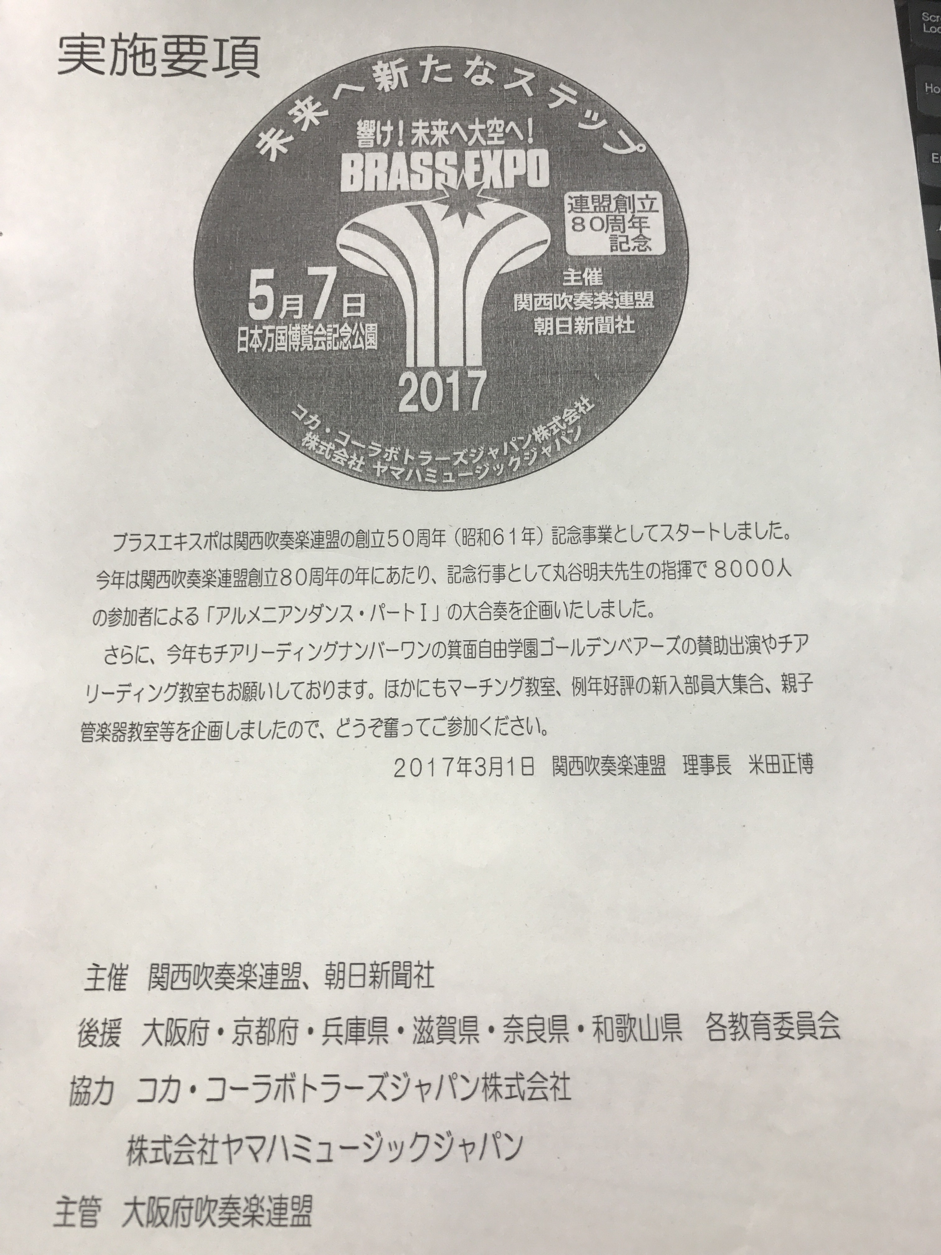 ブラスエキスポ2017のご案内 2017年4月28日イベント案内管理人 5月7日(日) 日本万国博覧会記念公園にて、現役達も元気に参加します。 単独パレードは、東コース 33番目のスタートです。 是非、応援にお越しください。