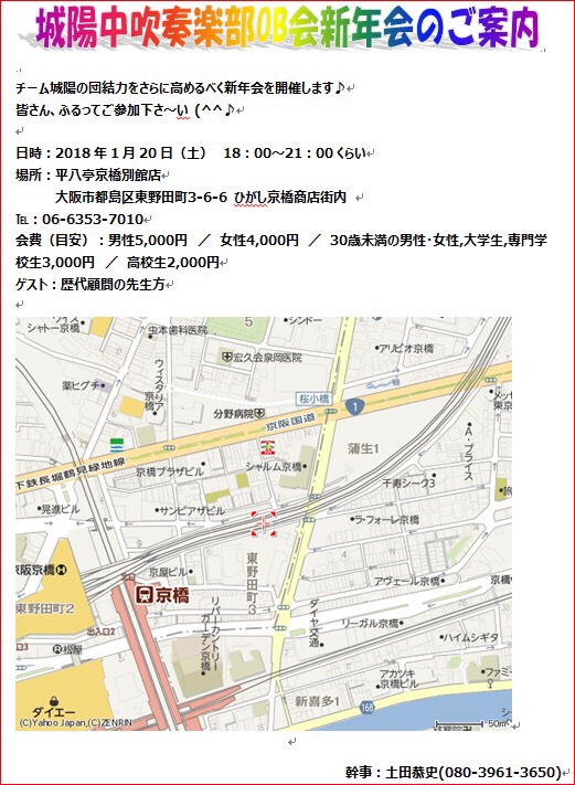 参加希望の方は、幹事または各世代の連絡担当者までご連絡ください(このHPへのコメントでもOKです)。なお、〆切は、平成30年1月5日(金)とさせて頂きます。