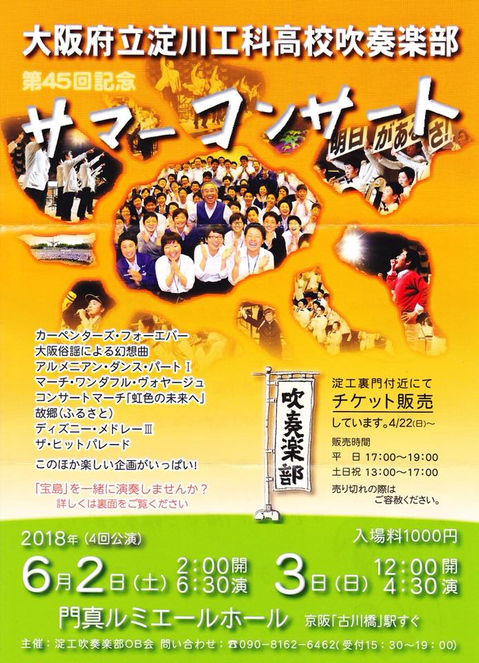 演奏会のお知らせ☆淀川工科高校吹奏楽部サマーコンサート 2018年5月14日イベント案内芝野(後藤) 範子 表記演奏会が開催される運びとなっています。 本校吹奏楽部のOBOGも多数出演されますので、ご声援宜しくお願い致します♪