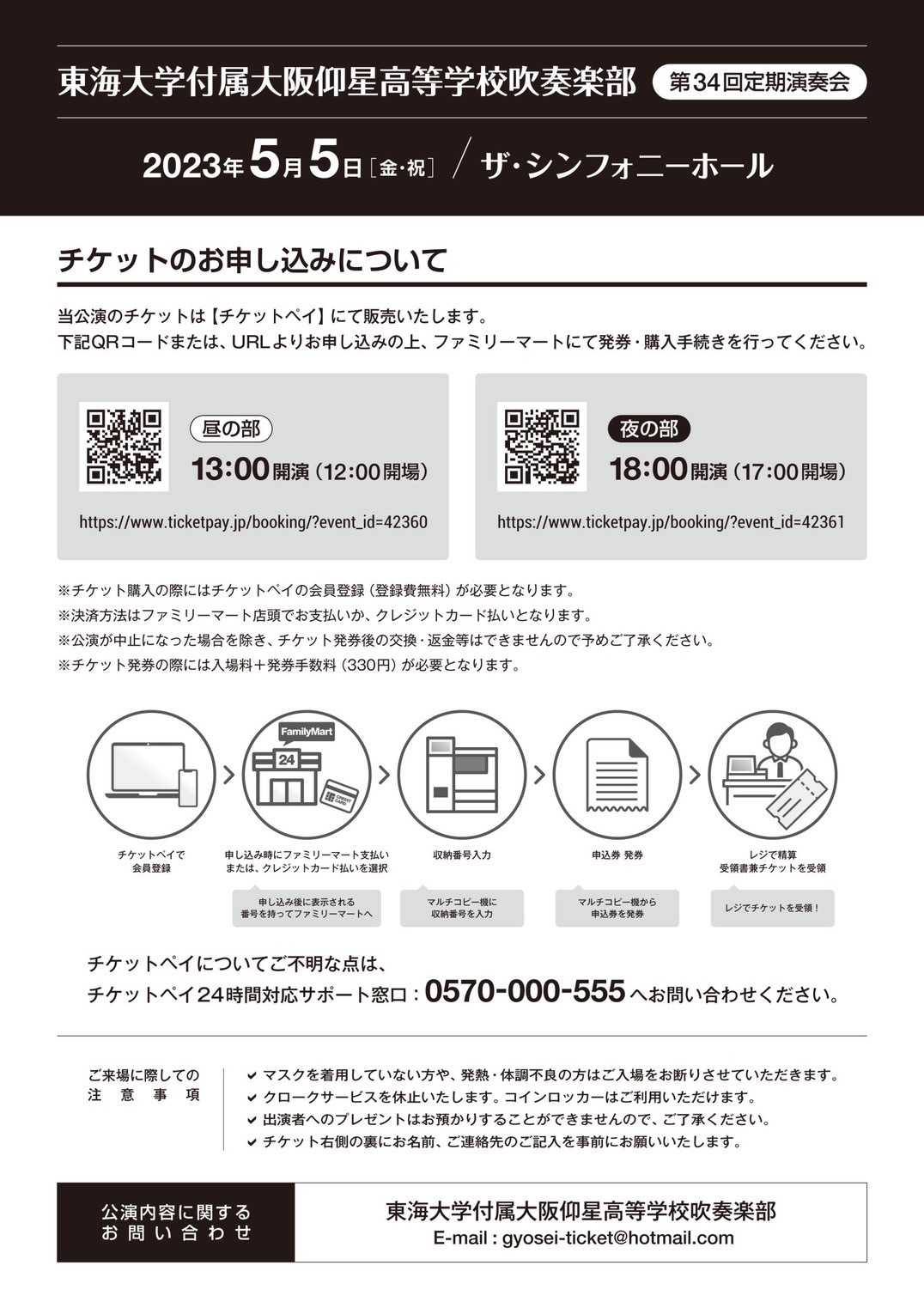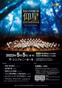 東海大学付属大阪仰星高等学校吹奏楽部第34回定期演奏会のお知らせ♪ 2023年2月27日お知らせ, その他コンサート, イベント案内川添 草太 東海大学付属大阪仰星高等学校吹奏楽部第34回定期演奏会のお知らせ♪ チケットペイにて受付中です! チケットペイホームページで「仰星」と検索すると購入可能です。 日時:5月5日(金・祝) 昼の部 12時開場 13時開演 夜の部 17時開場 18時開演 チケット料金:1500円 会場:ザ・シンフォニーホール 本校吹奏楽部卒業生が出演します♪ ご声援のほど、よろしくお願いします!