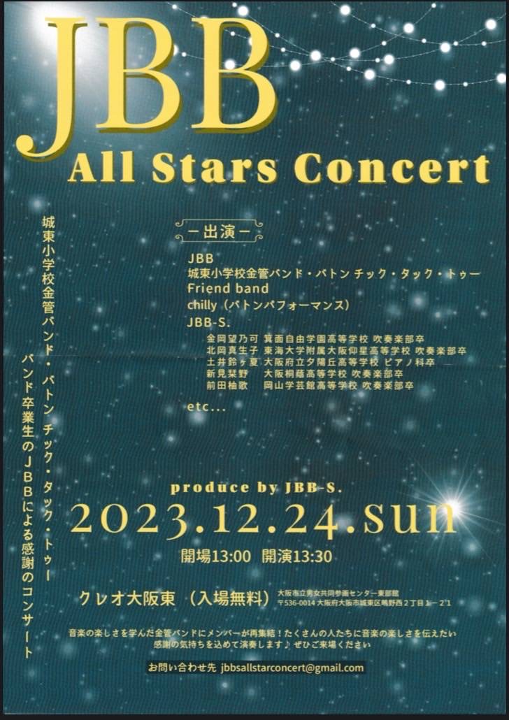 JBBオールスターズコンサートのお知らせ♪ 2023年12月16日OB連絡事項, お知らせ, その他コンサート, イベント案内, 連絡事項川添 草太 JBBオールスターズコンサートのお知らせ♪ 日時:12月24日(日) 昼の部 13時開場 13時30分開演 会場:クレオ大阪東 入場料:無料 本校吹奏楽部卒業生が出演します♪ ご声援のほど、よろしくお願いします!