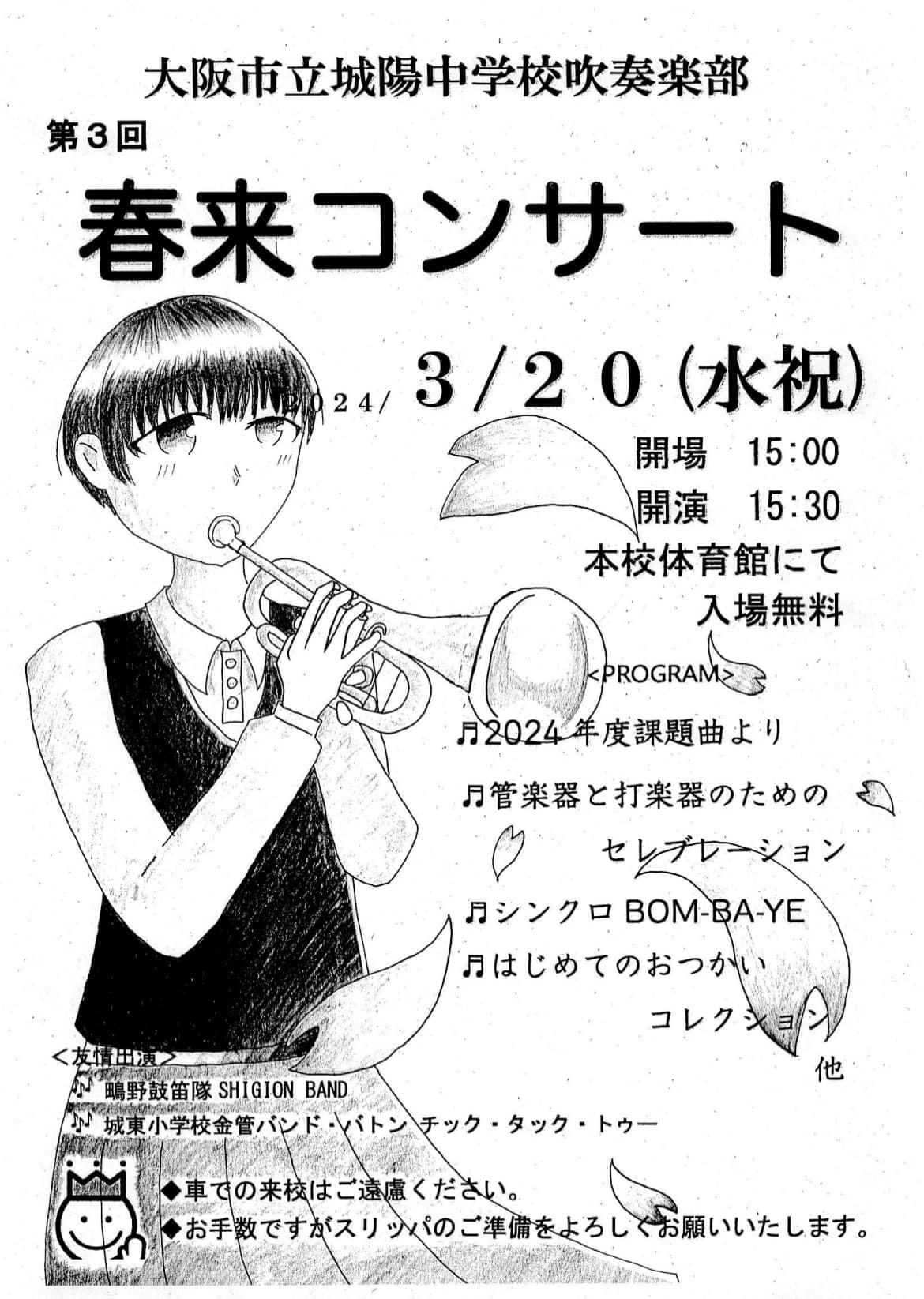【大阪市立城陽中学校吹奏楽部 第3回春来コンサートのご案内】