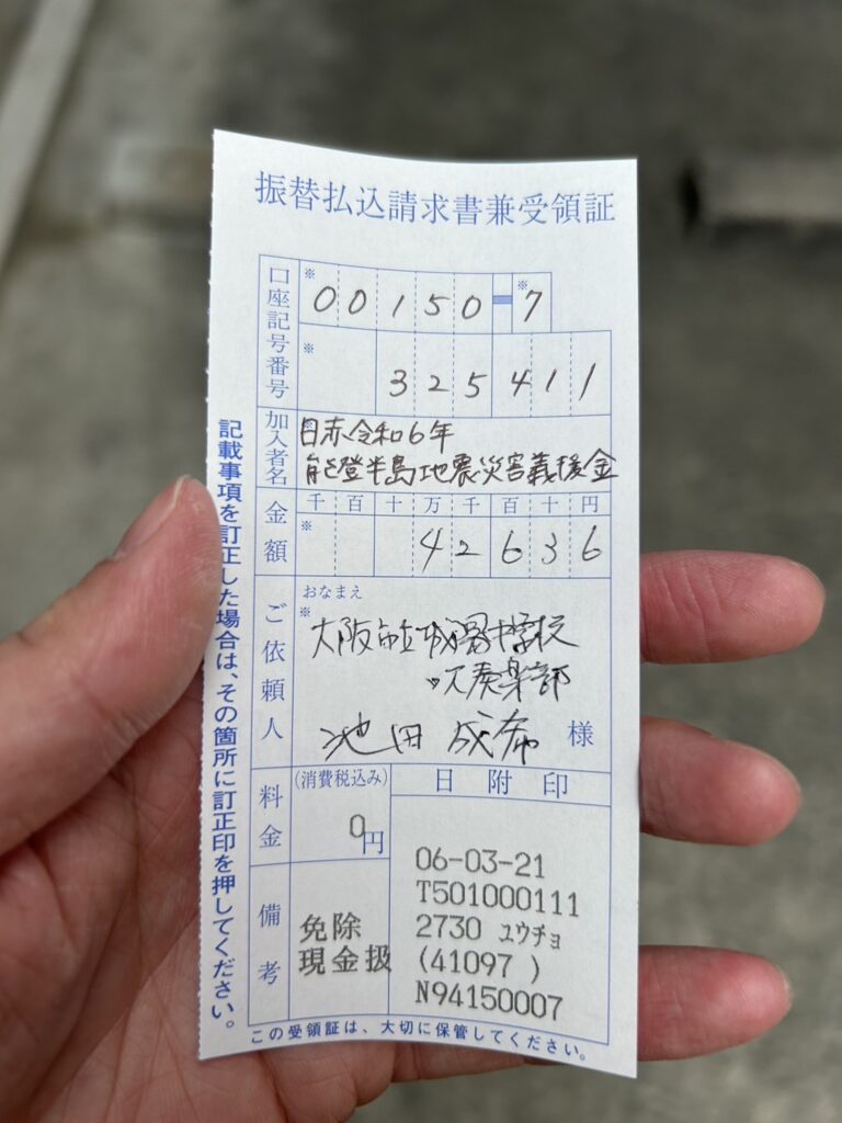 先日開催しました「第3回春来コンサート」におきまして、約200名の方々が見に来てくださり、無事盛会に終えることが出来ました。 また、義援金のご協力、本当にありがとうございました。 集まった義援金 42,636円 を、本日「日本赤十字社」に送金しました。 今後とも吹奏楽部をよろしくお願いいたします。