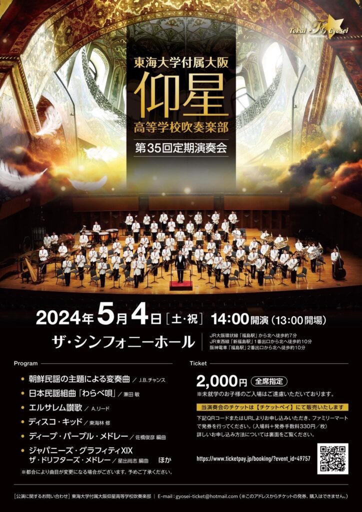 東海大学付属大阪仰星高等学校第35回定期演奏会のお知らせ♪ 2024年4月28日お知らせ川添 草太 東海大学付属大阪仰星高等学校第35回定期演奏会のお知らせ♪ 日時:2024年5月4日(土・祝) 13時開場 14時開演 全席指定:2,000円会場:ザ・シンフォニーホール 本校吹奏楽部卒業生が出演します♪ ご声援のほど、よろしくお願いします!